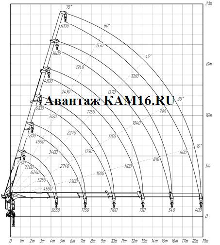 грузоподъемность на максимальном вылете стрелы 18.8 метрах — 400 кг.